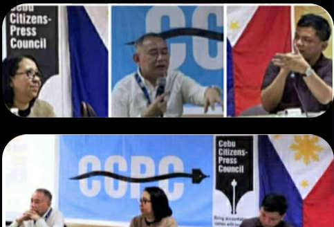Main resource speakers in person: (top, center) PPI’s Ariel Sebellino and PAO’s Atty. Maria G-Ree Calinawan,with moderator Ian Vincent Manticajon, a lawyer-columnist. Jose Torre Jr., PTFoMS chief, sent a video message. The forum was held at the MBF Cebu Press Center in Lahug, Cebu City.