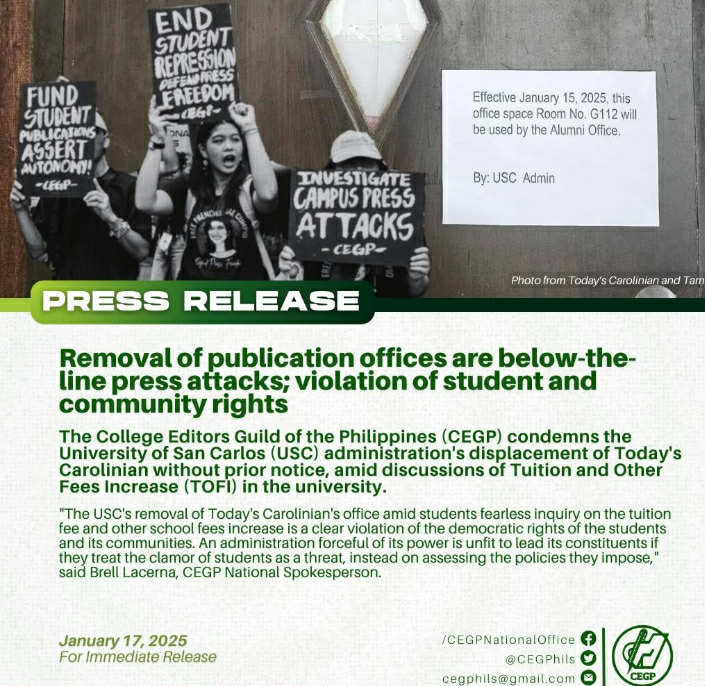 [] A protest of “Carolinian Today” campus writers — held Tuesday, January 21, 2025, at University of San Carlos (USC) Talamban campus in Cebu City — called for “press freedom” and return of the publication’s office at the main campus. An eviction notice was posted on its door, setting a January 15 deadline, as the space will be used for USC alumni affairs.